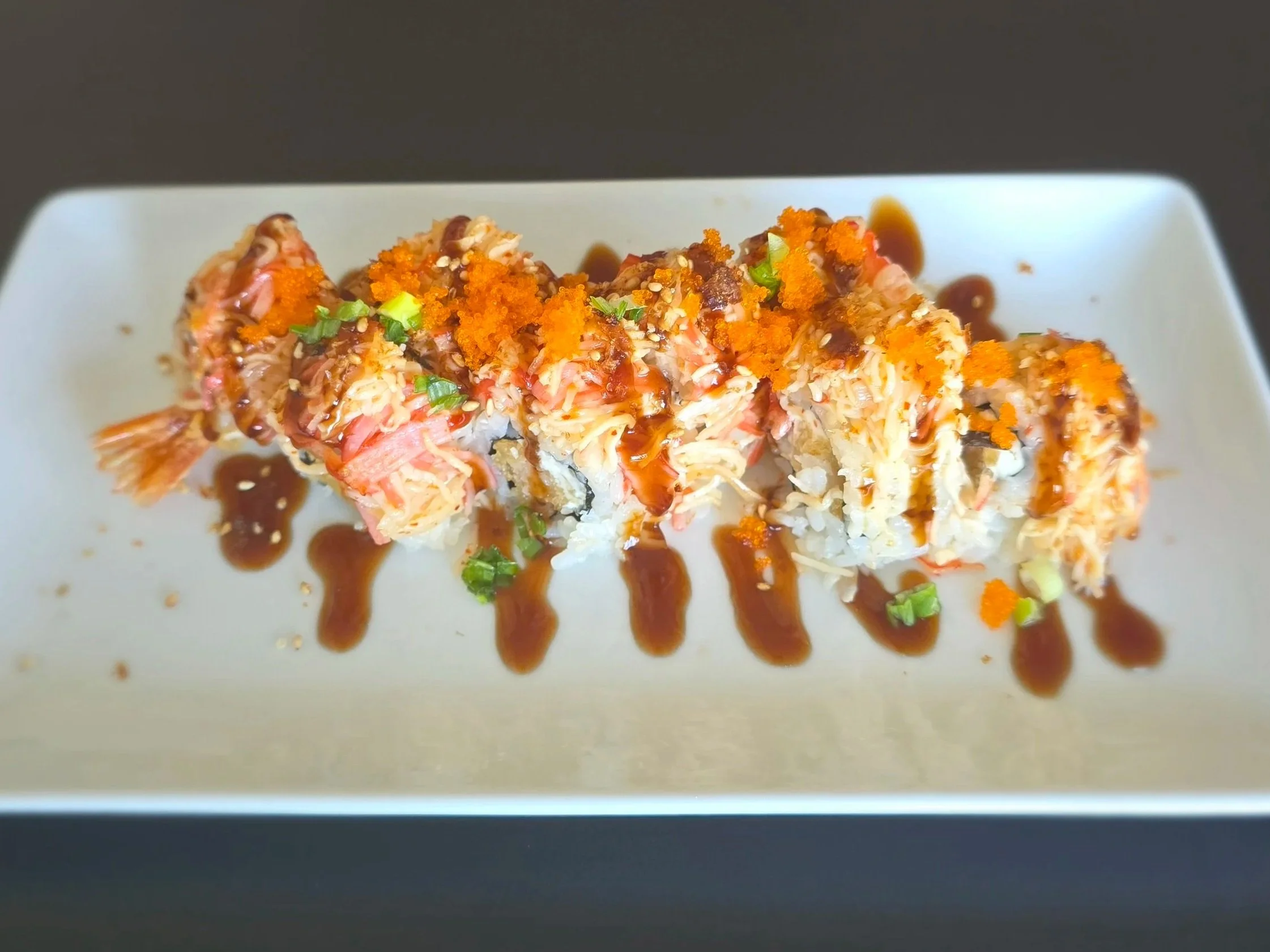 lobster tempura (5 oz), cream cheese, avocado + topped with krab stick, tempura crunch, masago, spicy mayo, and eel sauce